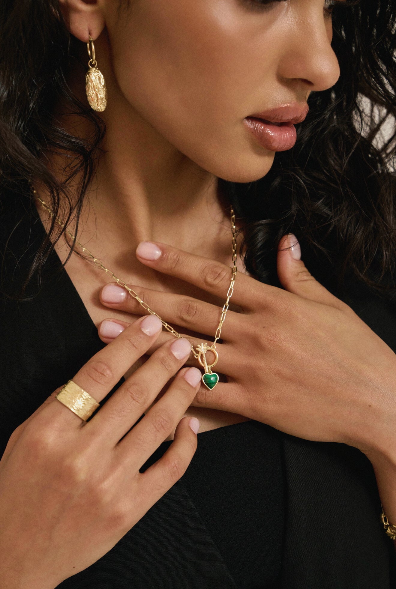 قلادة The Arch (ذا ارتش) المصنوعة من ڤيرميل الذهب ( فضة استرليني مطلية ذهب عيار ١٨ طلاء سميك)، وهي الأكثر مبيعًا لدينا. بلا شك لتميزها بأسر سحر وجمال المناظر الطبيعية في اراضينا. التصميم يحاكي هذا الجمال ببساطة وأناقة، قوس مستوحى من النوافذ والأبواب في التصاميم المعمارية، ومن خلالها نرى النخلة والهلال محفوف بنجوم سماء الصحراء الخلابة.
